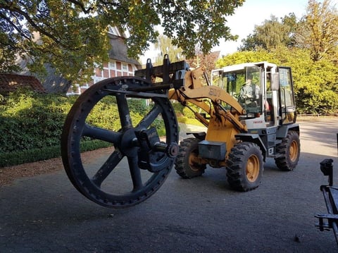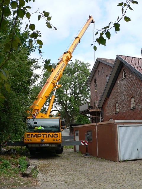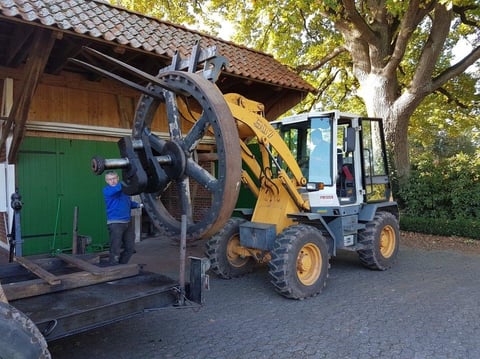 Das stellte sich schnell als eine logistische Herausforderung dar. Nach einer Vorort-Besichtigung und viel Vorarbeit durch Werner Hasselmann und einige Helfer wurde im Sommer 2018 ein Spezialkran der Cuxhavener Firma Empting geordert, der den Motor aus dem Gebäude heraus hob. Mit einem Tieflader erfolgt dann der Transport nach Ostendorf zu Werner Hasselmann, der Räumlichkeiten für die Zwischenlagerung zur Verfügung stellte. Bis es soweit war, mussten zunächst das Dach des Nebengebäudes in dem sich der Motor befand, geöffnet und dann ein Teil eines Balkons abgetragen werden.
